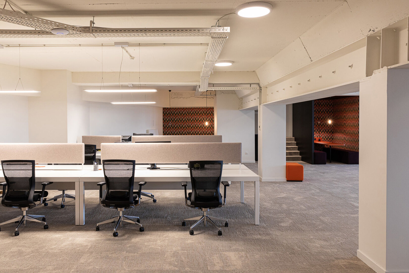 Dit kantoor, met een oppervlakte van ca. 915 m², is voorzien van een ruime openspace, afwisselend met enkele concentratiewerkplekken, phoneboots en ontspanningsruimte. Daarnaast zijn er verschillende vergaderzalen voorzien met ruimte voor 4 tot 30 personen. De kantoorruimte vloeit mooi over in de open leefkeuken en ontspanningsruimte met een uitzonderlijk zicht op de Schelde.