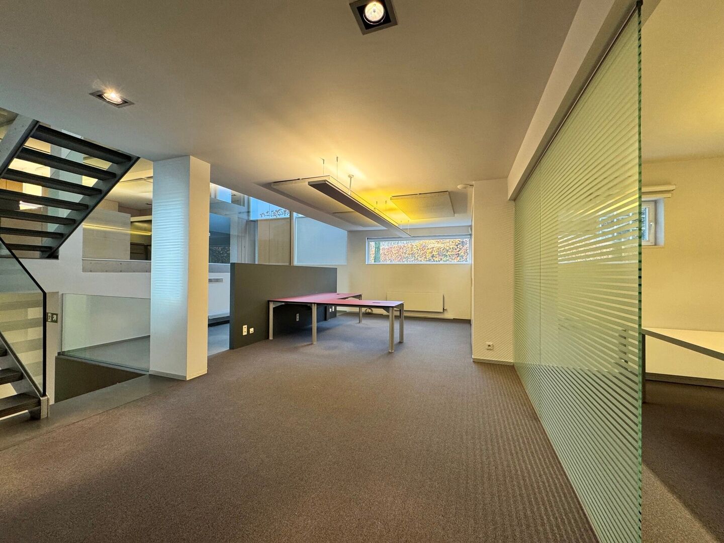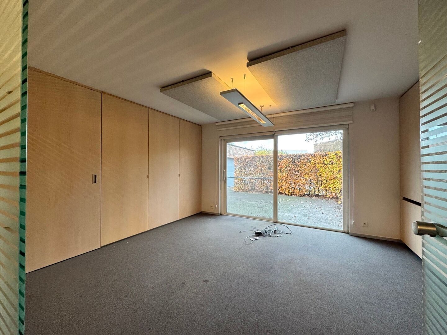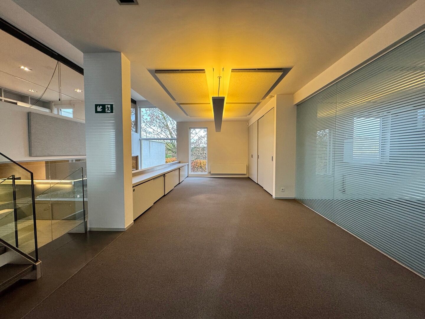 Via de voordeur kom je in een onthaalruimte met bijhorende receptie. De gelijkvloerse verdieping omvat diverse kantoorruimtes en vergaderzalen, waarvan sommige zijn uitgerust met ingebouwde kasten. Deze ruimtes kunnen eenvoudig van elkaar worden gescheiden met schuifdeuren. Daarnaast is er ook een kitchenette aanwezig.