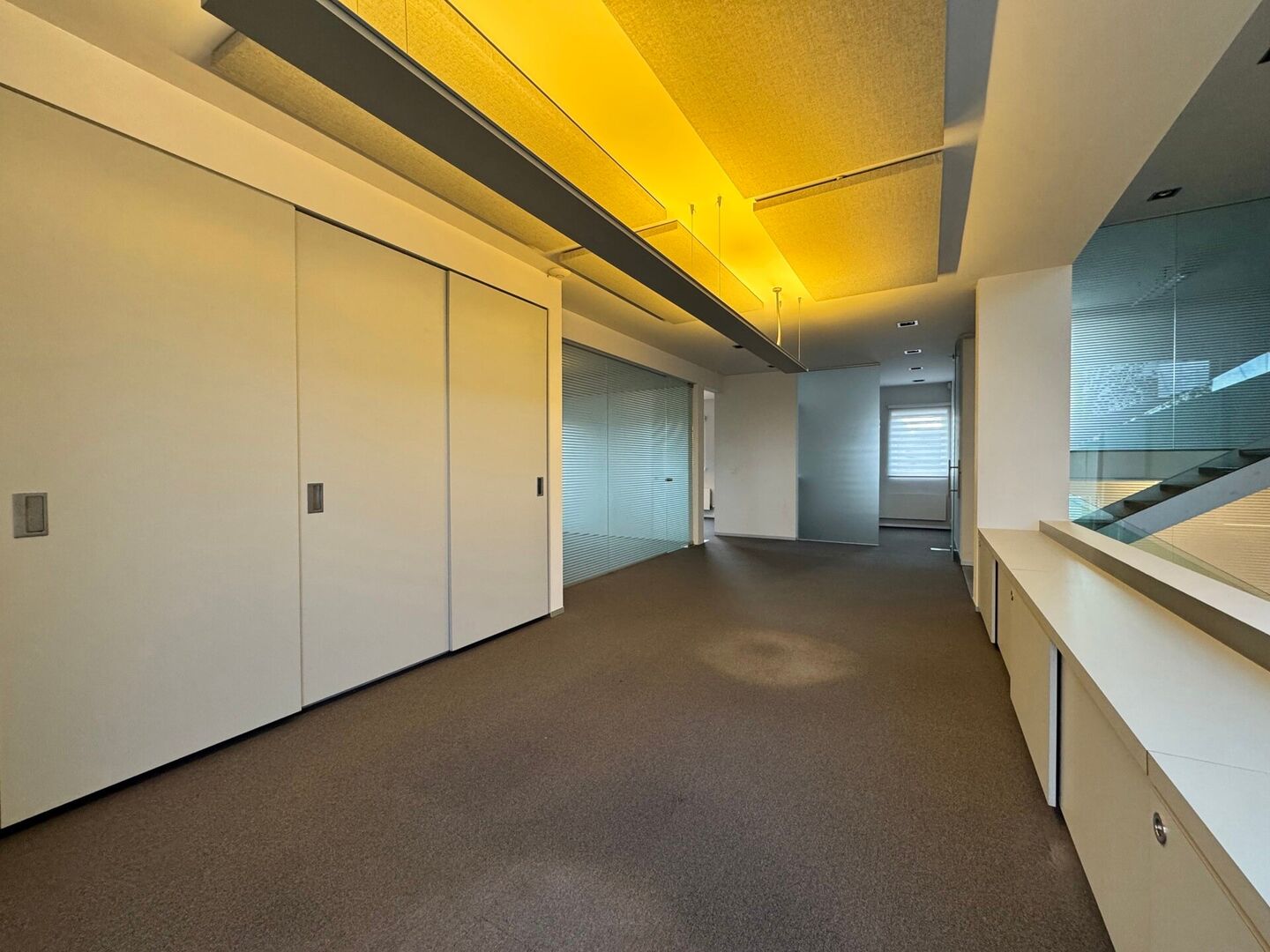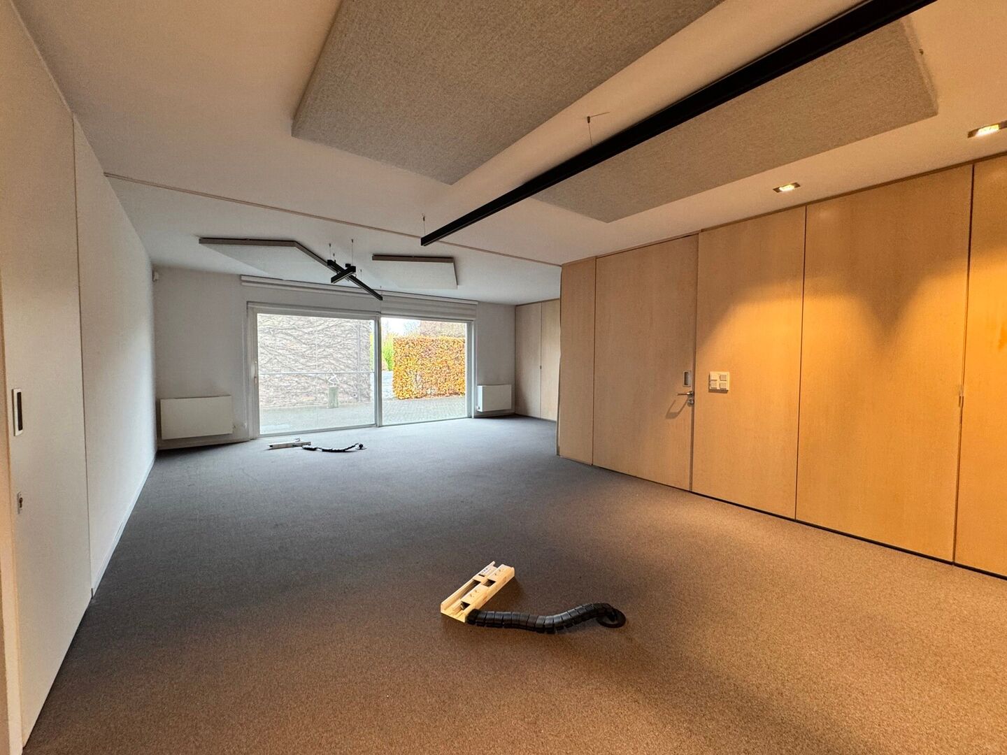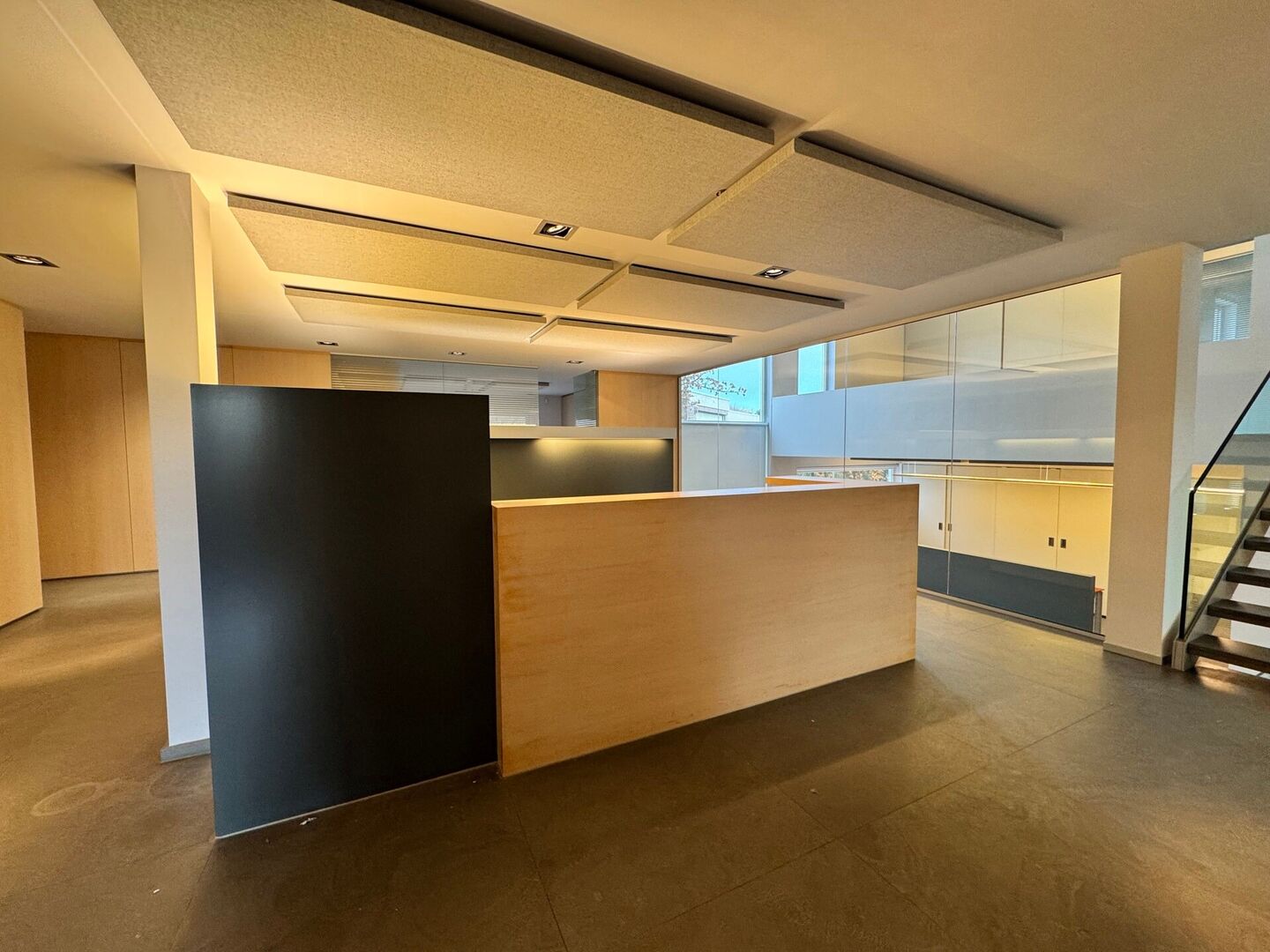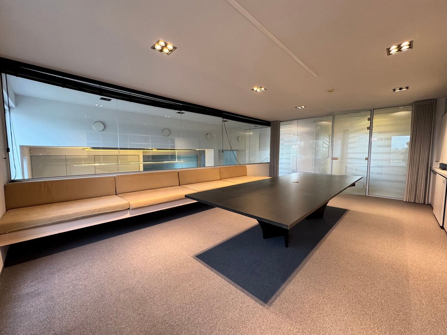Via de voordeur kom je in een onthaalruimte met bijhorende receptie. De gelijkvloerse verdieping omvat diverse kantoorruimtes en vergaderzalen, waarvan sommige zijn uitgerust met ingebouwde kasten. Deze ruimtes kunnen eenvoudig van elkaar worden gescheiden met schuifdeuren. Daarnaast is er ook een kitchenette aanwezig.