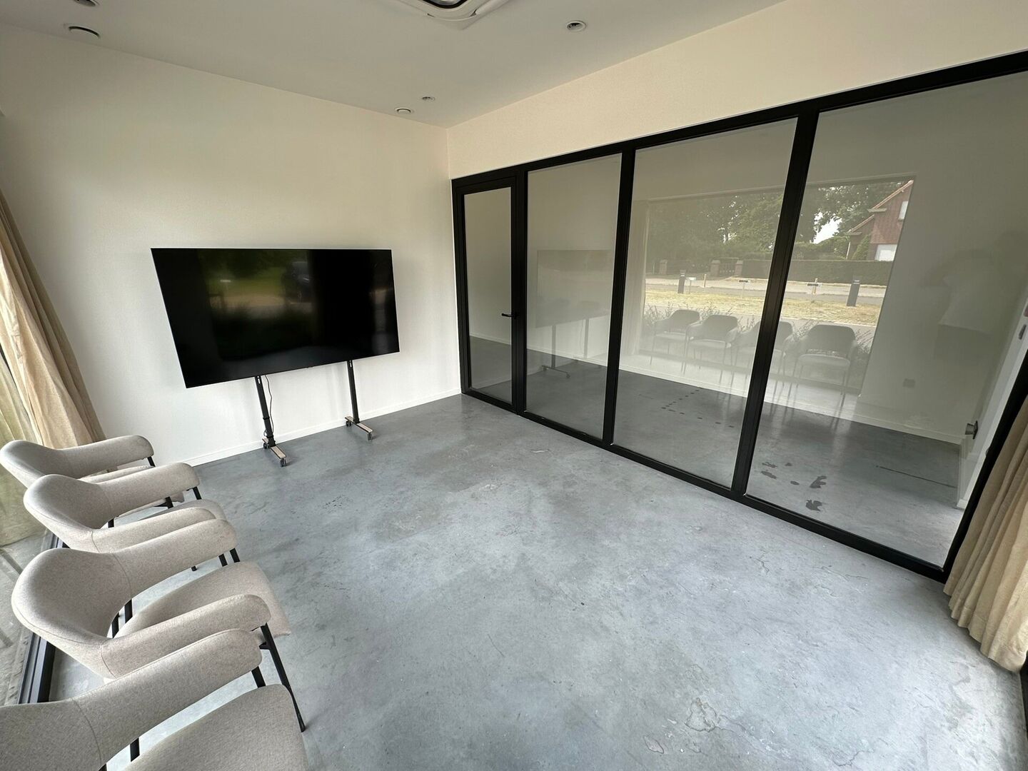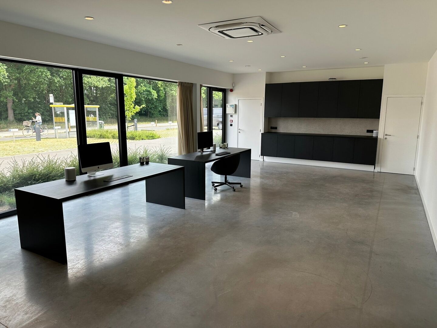 Het kantoor heeft een oppervlakte van ca. 100 m² en is voorzien van een aparte vergaderruimte, een mooie open ruimte, 2 toiletten met lavabo en een uitgeruste keuken. Deze ruimtes worden verwarmd door middel van een warmtepomp (lucht-lucht) en verlucht door middel van een ventilatiesysteem type D.