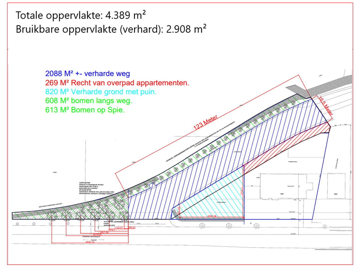De centrale betonverharding omvat een oppervlakte van ca. 2.088 m². Tevens is er een graszone van ca. 820 m² beschikbaar op een verharde puinlaag, die mee benut kan worden. De overige ruimte op het perceel is aangeplant met bomen en overige groenvoorziening.