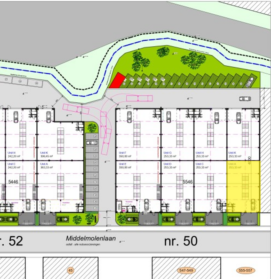 Unit 50 A omvcat ca. 253 m² opslagruimte/werkplaats, met een vrije hoogte van 6 meter.