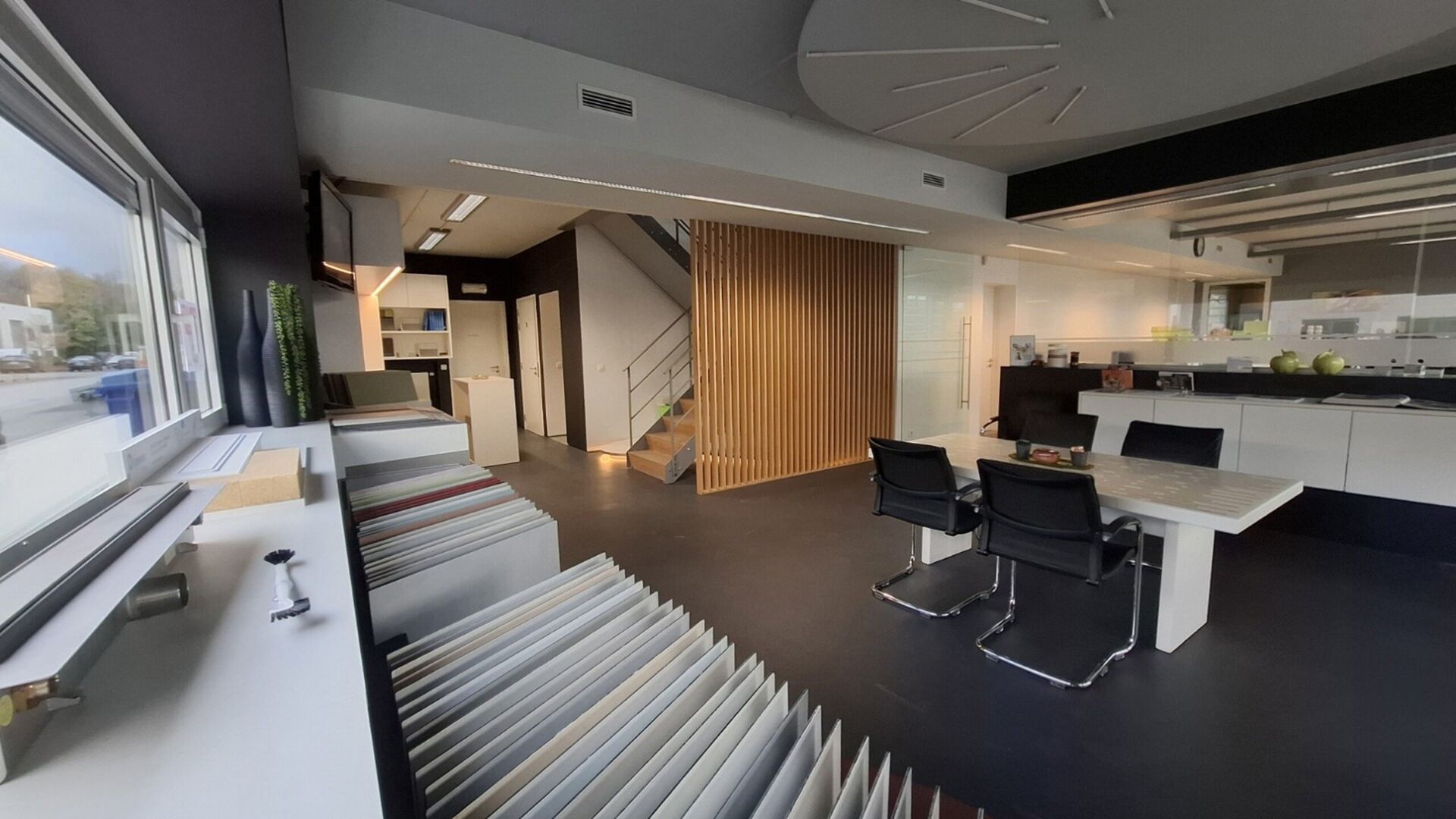 De unit omvat ca. 360 m² kantoor/showroom verdeeld over het gelijkvloers en de eerste verdieping, aangevuld met een magazijn/atelier van ca. 252 m² en tien private parkeerplaatsen.